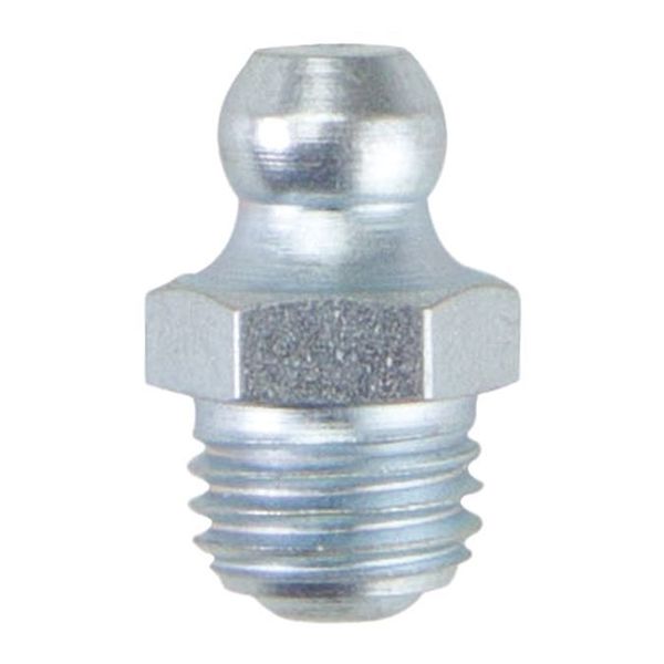 Description Grease Fitting, Grease Fitting Style Standard, Fitting Material Steel, Fitting Finish Zinc-Plated, Fitting Head Angle Straight, Fitting Thread Size M8-1.00mm, Fitting Thread Type Metric, Overall Length 5/8 in, Max. Pressure 5,000 psi, Meets/Exceeds DIN 71412, Package Quantity 10
