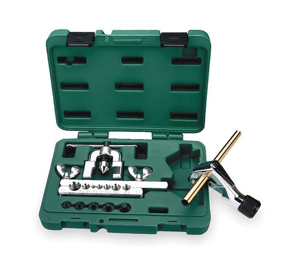 SKU G1442244CategoriesDescription Flaring and Tubing Cutter Set, Kit Type Flaring and Tubing Cutter Kit, Material Application Aluminum, Brass, Copper, Minimum Cutting Capacity 0.125 in, Maximum Cutting Capacity 1.125 in, Flare Type Double 45 Degree, Tube Flaring Size 3/16 in, 1/4 in, 5/16 in, 3/8 in, 7/16 in, 1/2 in, 5/8 in, Non-Sparking No, Container Type Case, Features Fold-Away Reamer, Includes Spare CuttergraingerSKU: 3CYT7, mscSKU: , zoro_no: G1442244, mongo_id: 65bbe7c63aaddbd5a90b5e07