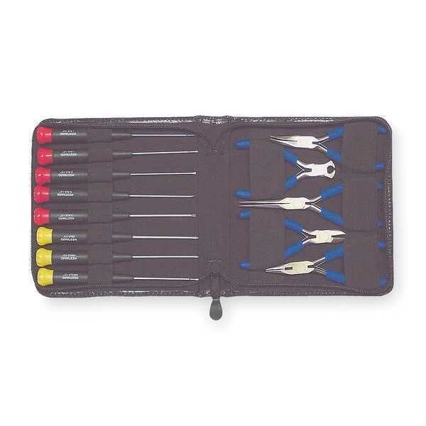 Description Electronics Tool Kit, Tool Storage Type Tool Case, Measurement Type Not Applicable, Drive Size Sockets Not Included, Number of Pieces 13, Pliers Included (1) Diagonal-Cutting Pliers, (2) Long-Nose Pliers, Screwdrivers, Keys, and Bits Included (3) Phillips Screwdrivers, (5) Slotted Screwdrivers, Sockets, Drive Tools, and Accessories Included None, Wrenches Included None, Striking and Struck Tools Included None, Cutting Tools Included None, Plumbing Tools Included None