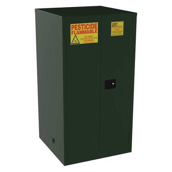 Description Pesticide Cabinet, Safety Cabinet Type Standard, Capacity 60 gal, Height 65 in, Width 34 in, Depth 34 in, Safety Cabinet Door Type Self-Closing, Number of Cabinet Shelves 2, Color Green, Number of Doors 2