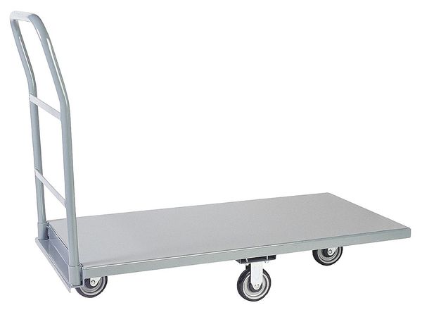 Description Steel-Deck Platform Truck, Load Capacity 1,200 lb, Overall Height 45 in, Overall Length 41 in, Overall Width 19 in, Deck Construction Solid, Deck Material Steel, Deck Finish/Coating Powder Coated, Deck Gauge 12 ga, Deck Height 9 in, Deck Length 36 in, Deck Width 18 in, Deck Surface Smooth, Frame Material Steel, Frame Finish/Coating Powder Coated, Handle Type Removable Raised, Lip Style Flush, Side Panel Type No Side Panels, Number of Platforms 1, Color Gray