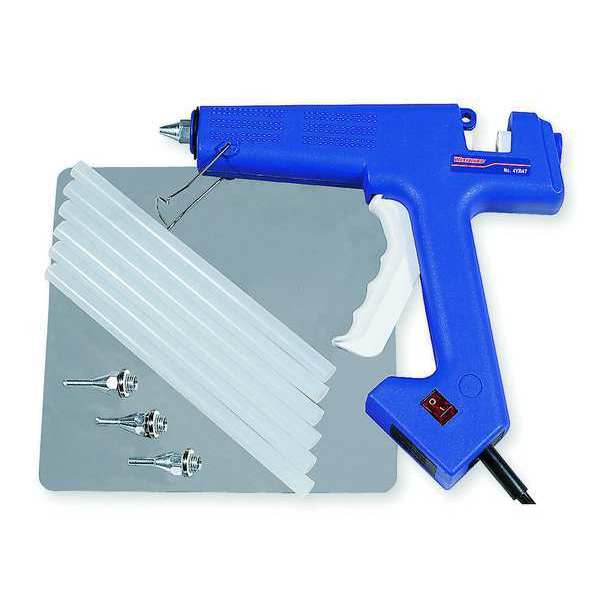 SKU G0817826CategoriesDescription Glue Gun, Operation Style Finger Trigger, Compatible Format Smooth Sticks, Maximum Operating Temperature 410 Degrees F, Output Rate 1.32 lb/hr, Power Source Corded, Voltage 120V, Tool Weight 0.93 lb, Standards CE, UL Listed, Tool Length 9 5/8 in, Compatible Glue Stick Diameter 1/2 in, Includes (3) Special Use Nozzles, (6) High Temperature Glue Sticks, Carrying Case, Non-Stick Work Pad, Wire Stand, Wattage 100 WgraingerSKU: 4YR47, mscSKU: , zoro_no: G0817826, mongo_id: 65bbe8409a749db822781625