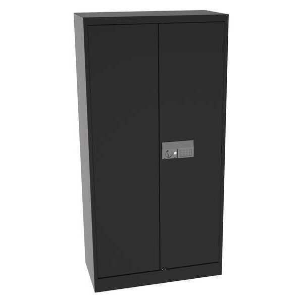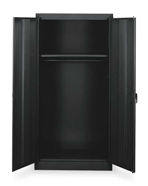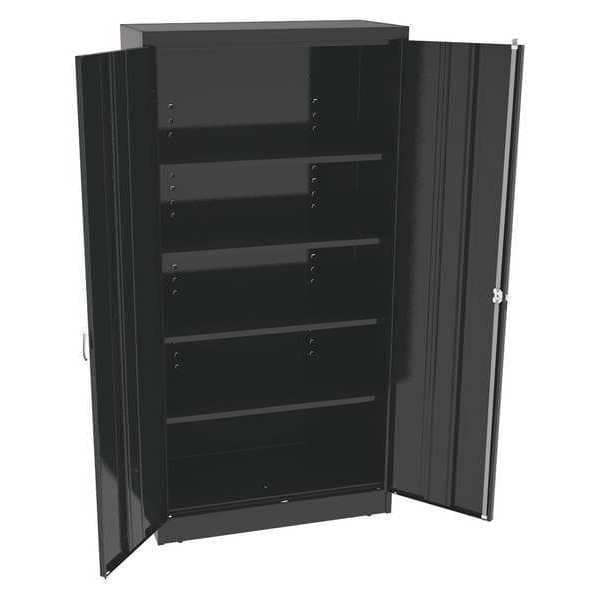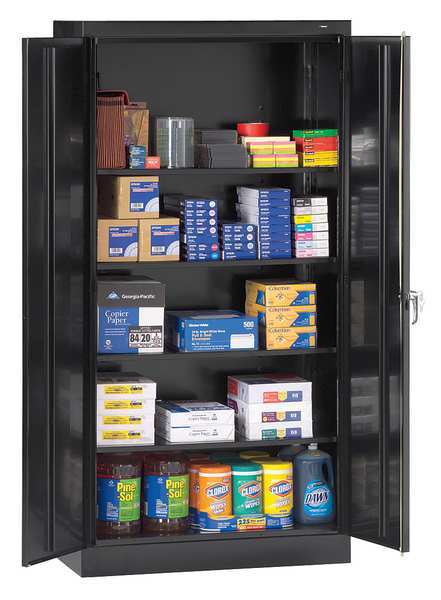 Description Storage Cabinet, Base Type Frame, Body Panel Type Solid, Cabinet Color Black, Cabinet Material Steel, Cabinet Storage Components Shelves, Door Handle Type Swing, Door Type Solid, Duty Rating Medium Duty, For Use Indoors/Outdoors No, Frame Assembled Assembled, Load Capacity per Shelf 200 lb, Lock Type Keyed, Mobility Stationary, Mounting Location Freestanding, Number of Shelves 4, Overall Depth 18 in, Overall Height 72 in, Overall Width 36 in, Audit Trail Storage None