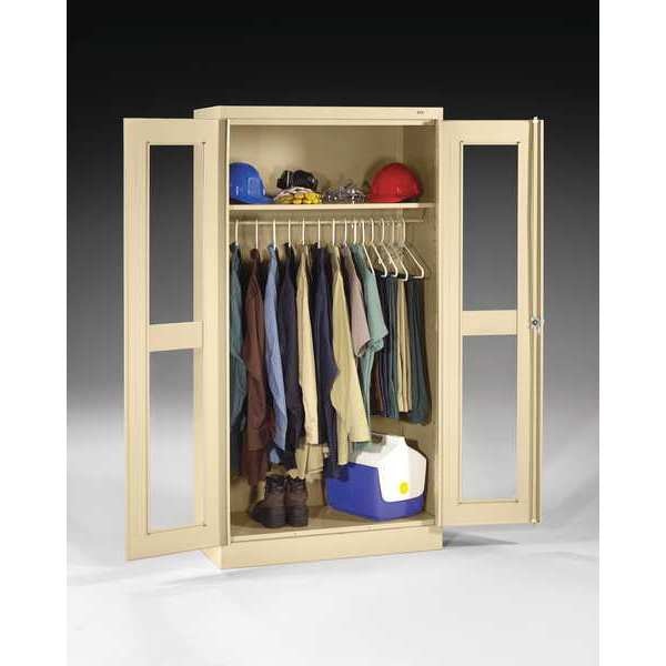 Description Storage Cabinet, Base Type Frame, Body Panel Type Solid, Cabinet Color Sand, Cabinet Material Steel, Cabinet Storage Components Hanging Rods, Shelves, Door Handle Type Swing, Door Type Clearview, Duty Rating Light Duty, For Use Indoors/Outdoors No, Frame Assembled Unassembled, Load Capacity per Shelf 200 lb, Lock Type Keyed, Mobility Stationary, Mounting Location Freestanding, Number of Shelves 5, Overall Depth 18 in, Overall Height 72 in, Overall Width 36 in, Audit Trail Storage None