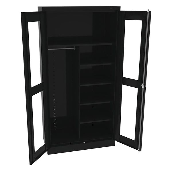 SKU G2117020CategoriesDescription Storage Cabinet, Base Type Frame, Body Panel Type Solid, Cabinet Color Black, Cabinet Material Steel, Cabinet Storage Components Hanging Rods, Shelves, Door Handle Type Swing, Door Type Clearview, Duty Rating Light Duty, For Use Indoors/Outdoors No, Frame Assembled Unassembled, Load Capacity per Shelf 200 lb, Lock Type Keyed, Mobility Stationary, Mounting Location Freestanding, Number of Shelves 5, Overall Depth 18 in, Overall Height 72 in, Overall Width 36 in, Audit Trail Storage NonegraingerSKU: 8X898, mscSKU: , zoro_no: G2117020, mongo_id: 65bbe7be3aaddbd5a90b208d