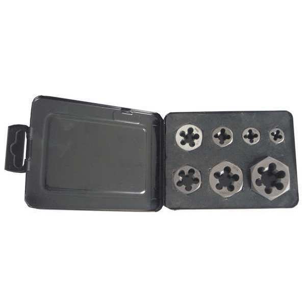Description Die Set, Hex, Solid, Carbon Steel, Number of Dies in Set 7, Thread Sizes Included M10x1.5, M12x1.75, M14x2, M16x2, M20x2.5, M6x1, M8x1.25, Thread Standard Metric, Thread Direction Right Hand, Die Sizes included M10x1.5, M12x1.75, M14x2, M16x2, M20x2.5, M6x1, M8x1.25