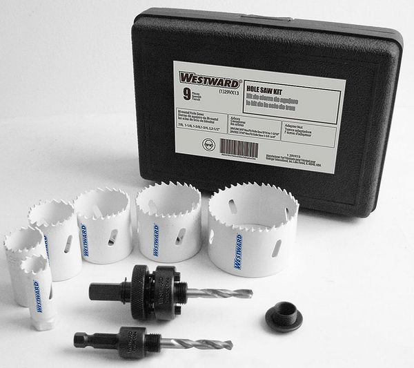 $79.86 / eachWeb priceHole Saw Electricians Kit, 9 pcs.SKU G9087784Categories Electric and Cordless ToolsDescription Hole Saw Kit, Primary Material Application Wood, Materials Cut Metal, Plastics, Sheet Metal, Wood, Arbor Design Not Included, Tooth Material Bi-Metal, Teeth per Inch 4/6, Max. Cutting Depth 1 1/2 in, Impact Rated No, Number of Hole Saws 6, Saw Size Range 7/8 in to 2 1/2 in, Hole Saw Sizes (Hole Saws) 7/8 in, 1 1/8 in, 1 3/8 in, 1 3/4 in, 2 in, 2 1/2 in, Thread Size 1/2 In.-20, 5/8 In.-18, Shank Size 3/8 in Hex, 7/16 in Hex, Pilot Drill Size 1/4 in dia x 3 in L, 1/4 in dia x 4 in LgraingerSKU: 29VX13, mscSKU: , zoro_no: G9087784, mongo_id: 65bbe6423aaddbd5a901a5d3