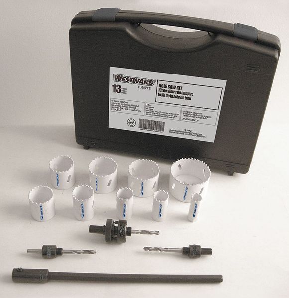 $184.99 / eachWeb priceHole Saw Master Electricians Kit, 13 pcs.SKU G8493231Categories Electric and Cordless ToolsDescription Hole Saw Kit, Materials Cut Metal, Plastics, Sheet Metal, Wood, Arbor Design Not Included, Tooth Material Bi-Metal, Teeth per Inch 4/6, Max. Cutting Depth 1 1/2 in, Impact Rated No, Number of Hole Saws 10, Saw Size Range 7/8 in to 4 1/2 in, Hole Saw Sizes (Hole Saws) 7/8 in, 1 1/8 in, 1 3/8 in, 1 3/4 in, 2 in, 2 1/2 in, 3 in, 3 5/8 in, 4 1/8 in, 4 1/2 in, Thread Size 1/2 In.-20, 5/8 In.-18, Shank Size 7/16 in Hex, Pilot Drill Size 1/4 in dia x 4 in L, Number of Pieces 13graingerSKU: null, mscSKU: null, zoro_no: G8493231, mongo_id: 65bbe6a83aaddbd5a90454a2