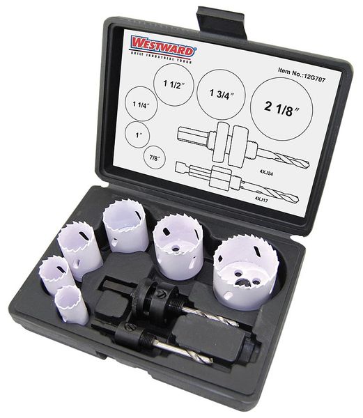 SKU G9087811CategoriesDescription Hole Saw Kit, Primary Material Application Wood, Materials Cut Metal, Plastics, Sheet Metal, Wood, Arbor Design Not Included, Tooth Material Bi-Metal, Teeth per Inch 4/6, Max. Cutting Depth 1 1/2 in, Impact Rated No, Number of Hole Saws 12, Saw Size Range 3/4 in to 4 1/2 in, Hole Saw Sizes (Hole Saws) 3/4 in, 7/8 in, 1 1/8 in, 1 1/2 in, 1 3/4 in, 2 1/4 in, 2 9/16 in, 3 in, 3 1/2 in, 4 in, 4 1/4 in, 4 1/2 in, Thread Size 1/2 In.-20, 5/8 In.-18, Shank Size 3/8 in Hex, 7/16 in HexgraingerSKU: 29VX16, mscSKU: , zoro_no: G9087811, mongo_id: 65bbe6643aaddbd5a9028a6a