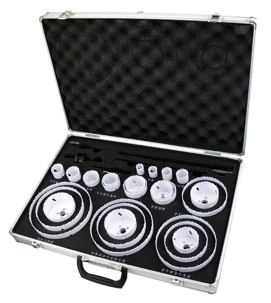 $158.74 / eachWeb priceHole Saw Plumbers Kit, 16 pcs.SKU G9087811CategoriesDescription Hole Saw Kit, Primary Material Application Wood, Materials Cut Metal, Plastics, Sheet Metal, Wood, Arbor Design Not Included, Tooth Material Bi-Metal, Teeth per Inch 4/6, Max. Cutting Depth 1 1/2 in, Impact Rated No, Number of Hole Saws 12, Saw Size Range 3/4 in to 4 1/2 in, Hole Saw Sizes (Hole Saws) 3/4 in, 7/8 in, 1 1/8 in, 1 1/2 in, 1 3/4 in, 2 1/4 in, 2 9/16 in, 3 in, 3 1/2 in, 4 in, 4 1/4 in, 4 1/2 in, Thread Size 1/2 In.-20, 5/8 In.-18, Shank Size 3/8 in Hex, 7/16 in HexgraingerSKU: 29VX16, mscSKU: , zoro_no: G9087811, mongo_id: 65bbe6643aaddbd5a9028a6a