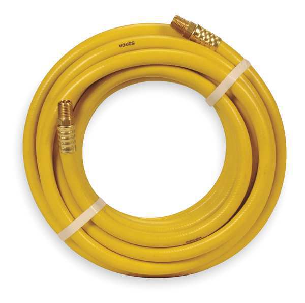 Description Air Hose, Hose Inside Dia. 1/4 in, Hose Outside Dia. 7/16 in, Hose Length 50 ft, Hose Color Yellow, Hose Tube Material PVC, Hose Cover Material PVC, Max. Working Pressure @ 70 F 300 psi, Temp. Range -10 Degrees to 158 Degrees F, Standards RMA Class B, Safety Factor 4:1, Hose Fitting A Material Brass, Hose Fitting B Material Brass, Hose Fitting A Type MNPT, Hose Fitting B Type MNPT, Hose Fitting A Size 1/4 in, Hose Fitting B Size 1/4 in, Hose Configuration Coupled Assembly