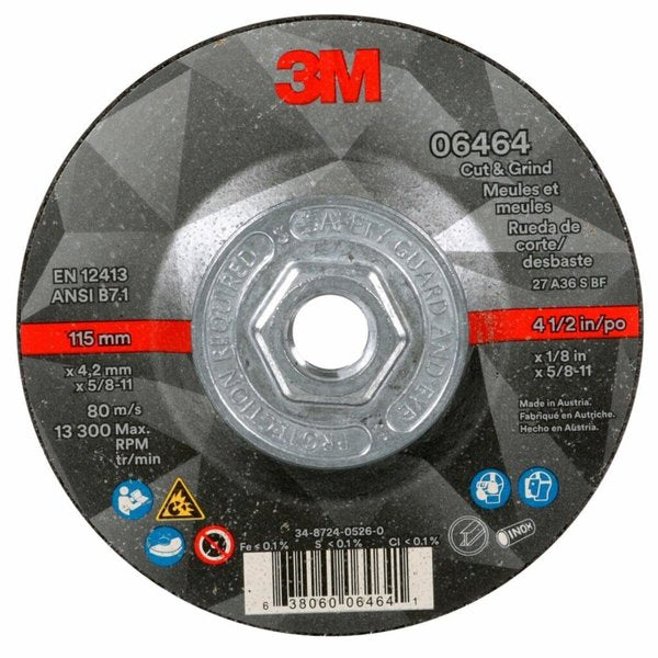 Description Cut-Off & Grinding Wheel, Abrasive Material Ceramic, Connector Size 5/8 In.-11, Connector Type Threaded Hole, Grit 36, Overall Diameter 4 1/2 in, Overall Thickness 0.125 in, Primary Material Applicationn Stainless Steel, Steel, Compatible Tool Type Angle Grinder, Series Cut & Grind, Wheel Type Type 27, Maximum Operating Speed 13,300 RPM, Color Black, Grade Not Applicable