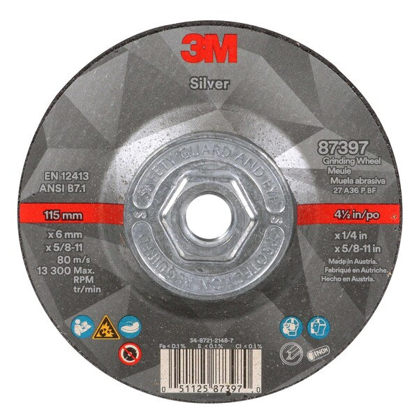 Depressed Center Wheels, Type 27, 4 1/2 in Dia, 0.25 in Thick, 5/8"-11 Arbor Hole SizeSKU G903673797CategoriesDescription Depressed Center Grinding Wheel, Abrasive Material Ceramic, Connector Size 5/8 In.-11, Connector Type Threaded Hole, Grit 36, Overall Diameter 4 1/2 in, Overall Thickness 0.25 in, Primary Material Applicationn Stainless Steel, Steel, Compatible Tool Type Angle Grinder, Series Silver, Wheel Type Type 27, Maximum Operating Speed 10,200 RPM, Grade PSGgraingerSKU: 787CP4, mscSKU: 20419388, zoro_no: G903673797, mongo_id: 65bbe8a222d7a989a9906e8b