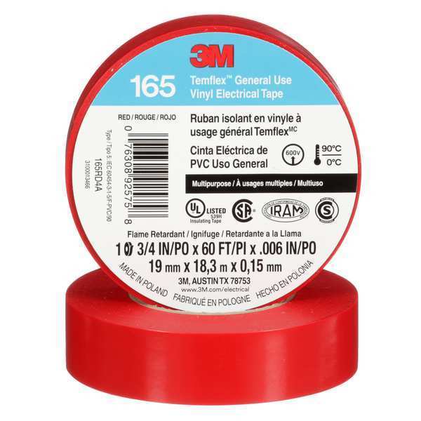 SKU G003510060Categories Adhesives, Epoxy & SealantsDescription Insulating Electrical Tape, General Purpose, Vinyl, Tape Adhesive Material Rubber, 3/4 in, 60 ft, 6 mil, 3M(TM), Temflex(TM), Series 165, Red, Minimum Tape Performance Temperature 32 Degrees F, Maximum Tape Performance Temperature 194 Degrees F, Voltage Rating 600 V, Continuous Roll, Single-SidedgraingerSKU: , mscSKU: , zoro_no: G003510060, mongo_id: 65bbe6313aaddbd5a9012e5e