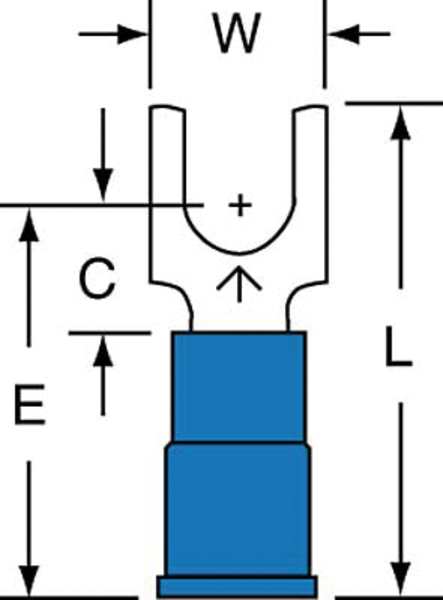 Description Fork Terminal, Insulation Color Blue, Stud Size #10, Standards CSA Certified, UL Listed, Connection Material Copper, Connection Type Crimp, Insulation Type Vinyl, Overall Length 0.85 in, Package Quantity 1000