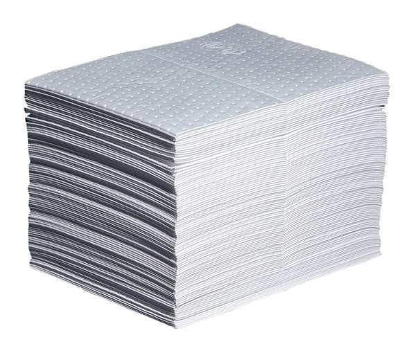 Description Product Type Sorbent Pad, Fluids Absorbed Universal, For Use With Chemical or Metal Type Universal, Size 15 in x 20 in, Volume Absorbed Per Pad 28 oz, Volume Absorbed per Pkg. 22 gal, Color/Pattern Gray, Material Polypropylene, Number of Layers 8-ply, Perforated Yes, Perforated Size 10 in x 15 in, Package Quantity 100
