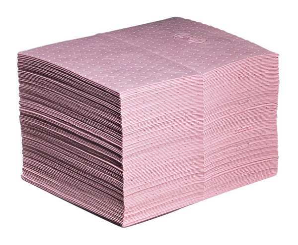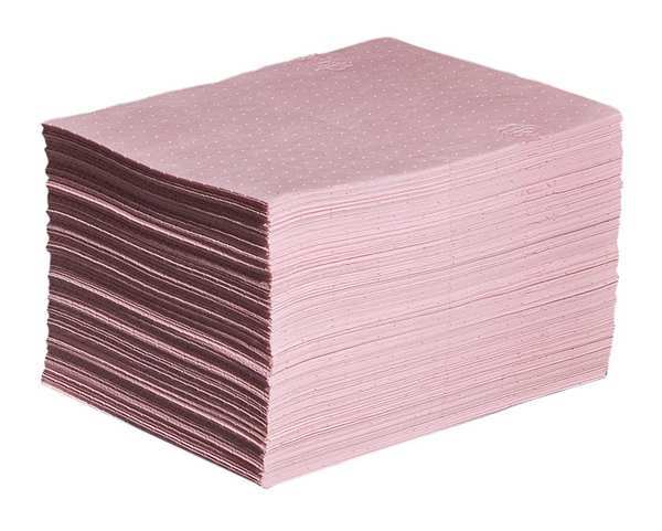 Description Product Type Sorbent Pad, Fluids Absorbed Universal, For Use With Chemical or Metal Type Universal, Bases, Corrosives, Hazardous Chemicals, Size 15 in x 20 in, Volume Absorbed Per Pad 28 oz, Volume Absorbed per Pkg. 22 gal, Color/Pattern Pink, Material Polypropylene, Number of Layers 8-ply, Perforated Yes, Perforated Size 10 in x 15 in, Package Quantity 100