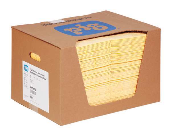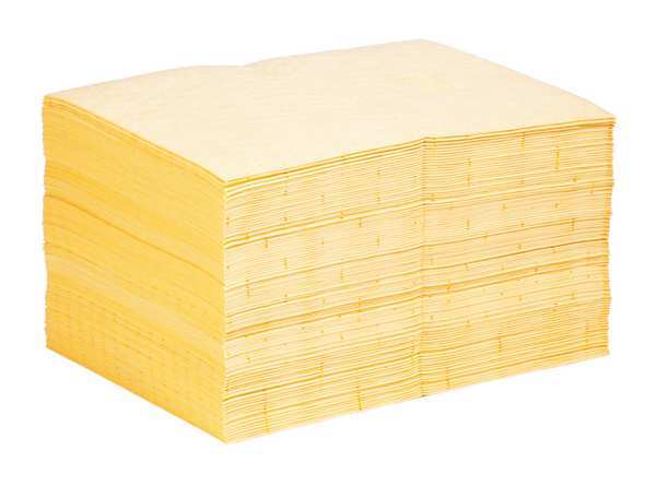 Description Product Type Sorbent Pad, Fluids Absorbed Universal, For Use With Chemical or Metal Type Universal, Size 15 in x 20 in, Volume Absorbed Per Pad 28 oz, Volume Absorbed per Pkg. 22 gal, Color/Pattern Yellow, Material Polypropylene, Number of Layers 8-ply, Perforated Yes, Perforated Size 10 in x 15 in, Package Quantity 100
