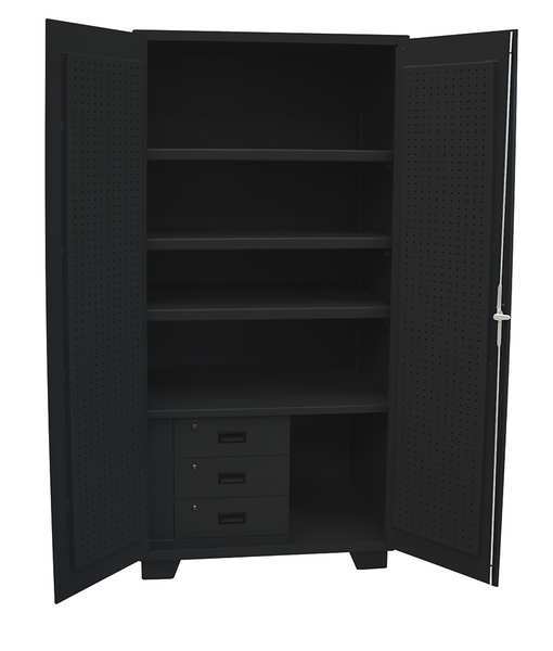 14 ga. ga. Steel Pegboard Storage Cabinet, 36 in W, 78 in H, StationarySKU G9945984CategoriesDescription Pegboard Cabinet, Base Type Legs, Body Panel Type Solid, Cabinet Color Black, Cabinet Storage Components Drawers, Pegboard, Shelves, Door Handle Type Swing, Door Type Solid, Duty Rating Extra-Heavy Duty, Frame Assembled Assembled, Includes Pegboard Hooks No, Mobility Stationary, Mounting Location Freestanding, Number of Shelves 3, Overall Depth 24 in, Overall Height 78 in, Overall Width 36 in, Peg Hole Shape Peg, Pegboard Location Door, Vertical Shelf Clearance 2 1/2 in, Audit Trail Storage NonegraingerSKU: null, mscSKU: null, zoro_no: G9945984, mongo_id: 65bbe5f23aaddbd5a9ff7a96