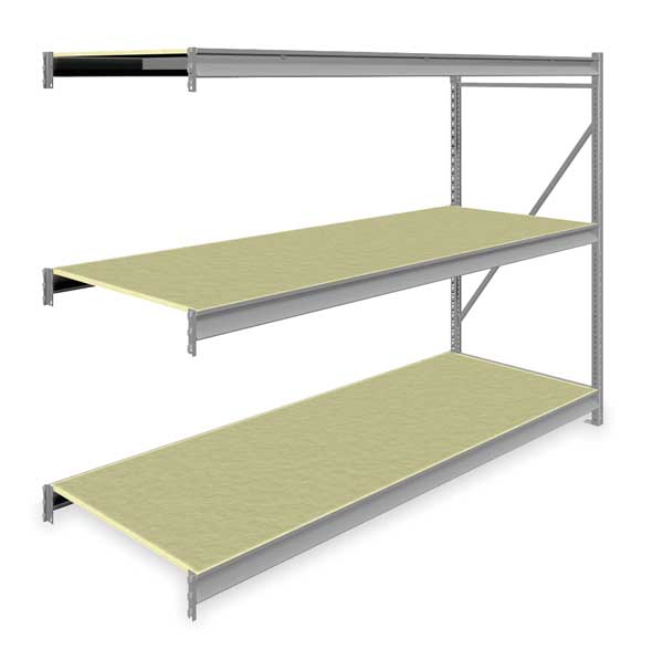 Description Bulk Storage Rack, Shelving Type Add-On, Overall Width 96 in, Overall Depth 36 in, Overall Height 96 in, Decking Material Particleboard, No. of Shelves 3, Shelf Capacity 2150 lb, Load Capacity 6450 lb, Shelving Frame Material Steel, Gray, Finish - Shelving and Racks Powder Coated, Shelf Adjustments 2 in, For Use With Tennesco Bulk Storage and Boltless Racks, Includes (3) Shelves, End Frame