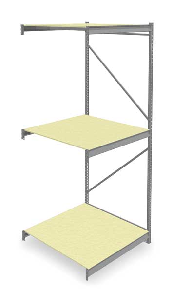 Description Bulk Storage Rack, Shelving Type Add-On, Overall Width 96 in, Overall Depth 36 in, Overall Height 72 in, Decking Material Particleboard, No. of Shelves 3, Shelf Capacity 2150 lb, Load Capacity 6450 lb, Shelving Frame Material Steel, Gray, Finish - Shelving and Racks Powder Coated, Shelf Adjustments 2 in, For Use With Tennesco Bulk Storage and Boltless Racks, Includes (3) Shelves, End Frame