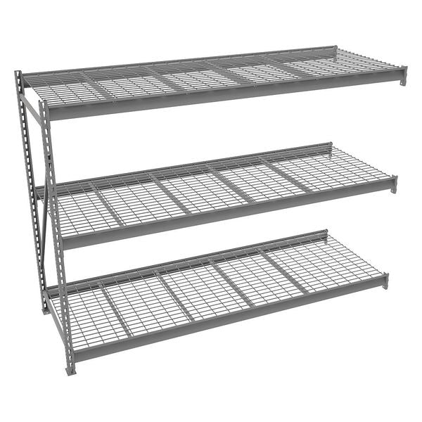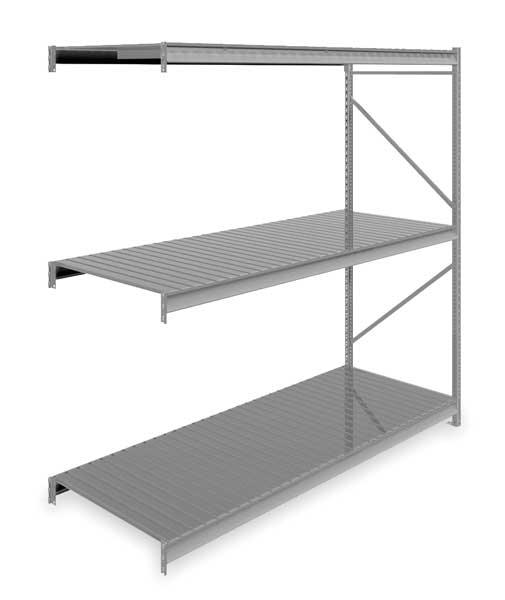 Description Bulk Storage Rack, Shelving Type Add-On, Overall Width 96 in, Overall Depth 36 in, Overall Height 96 in, Decking Material None, No. of Shelves 3, Shelf Capacity 2150 lb, Load Capacity 6450 lb, Shelving Frame Material Steel, Gray, Finish - Shelving and Racks Powder Coated, Shelf Adjustments 2 in, For Use With Tennesco Bulk Storage and Boltless Racks, Includes (3) Shelves, End Frame
