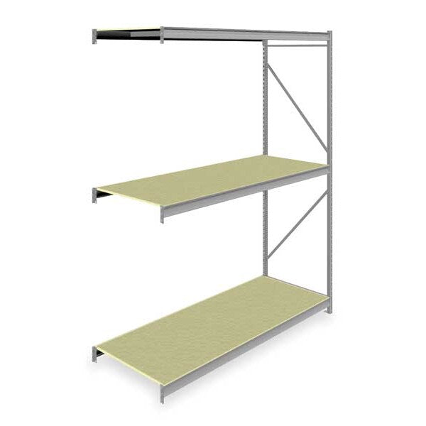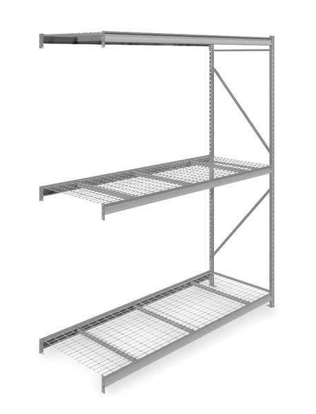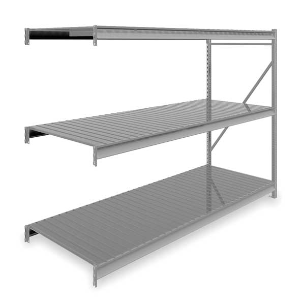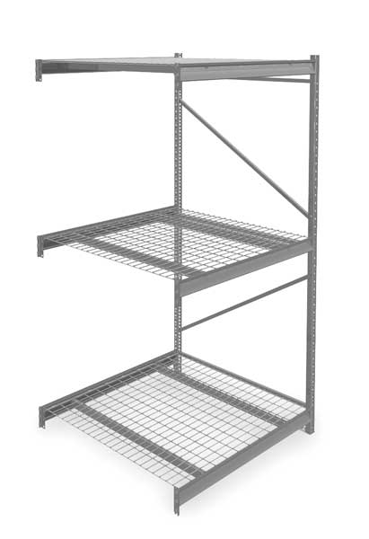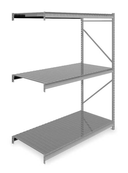 Description Bulk Storage Rack, Shelving Type Add-On, Overall Width 96 in, Overall Depth 36 in, Overall Height 120 in, Decking Material Steel, No. of Shelves 3, Shelf Capacity 2150 lb, Load Capacity 1500 lb, Shelving Frame Material Steel, Gray, Finish - Shelving and Racks Powder Coated, Shelf Adjustments 2 in, For Use With Tennesco Bulk Storage and Boltless Racks, Includes (3) Shelves, End Frame