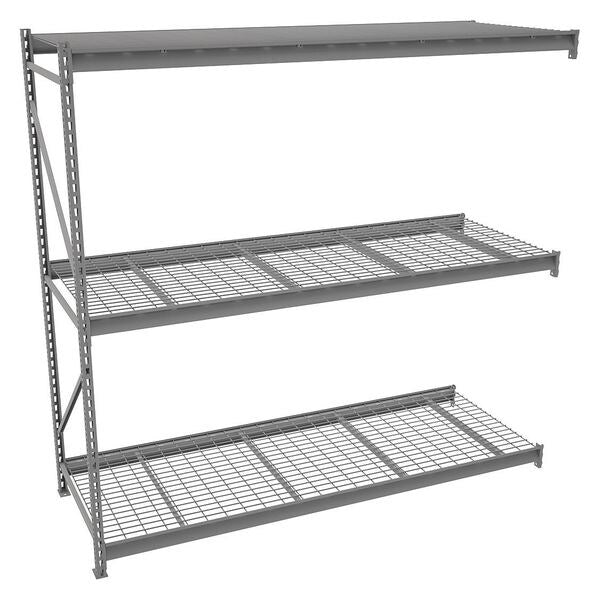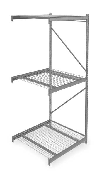 Description Bulk Storage Rack, Shelving Type Add-On, Overall Width 72 in, Overall Depth 36 in, Overall Height 96 in, Decking Material Steel, No. of Shelves 3, Shelf Capacity 2750 lb, Load Capacity 8250 lb, Shelving Frame Material Steel, Gray, Finish - Shelving and Racks Powder Coated, Shelf Adjustments 2 in, Shelving Gauge 22, For Use With Tennesco Bulk Storage and Boltless Racks, Includes (3) Shelves, End Frame