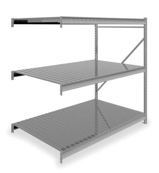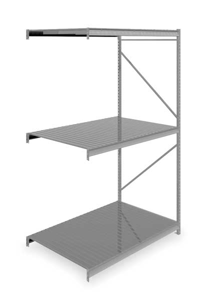 $409.99 / eachWeb priceAdd-On Bulk Storage Rack, 48 in D, 72 in W, 3 ShelvesSKU G0398711CategoriesDescription Bulk Storage Rack, Shelving Type Add-On, Overall Width 72 in, Overall Depth 48 in, Overall Height 120 in, Decking Material None, No. of Shelves 3, Shelf Capacity 2750 lb, Load Capacity 8250 lb, Shelving Frame Material Steel, Gray, Finish - Shelving and Racks Powder Coated, Shelf Adjustments 2 in, For Use With Tennesco Bulk Storage and Boltless Racks, Includes (3) Shelves, End FramegraingerSKU: 7B142, mscSKU: , zoro_no: G0398711, mongo_id: 65bbe95a22d7a989a994e760