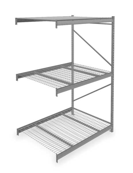 $578.74 / eachWeb priceAdd-On Bulk Storage Rack, 48 in D, 60 in W, 3 ShelvesSKU G3374314CategoriesDescription Bulk Storage Rack, Shelving Type Add-On, Overall Width 60 in, Overall Depth 48 in, Overall Height 96 in, Decking Material Steel, No. of Shelves 3, Shelf Capacity 3800 lb, Load Capacity 1500 lb, Shelving Frame Material Steel, Gray, Finish - Shelving and Racks Powder Coated, Shelf Adjustments 2 in, For Use With Tennesco Bulk Storage and Boltless Racks, Includes (3) Shelves, End FramegraingerSKU: 7B142, mscSKU: , zoro_no: G3374314, mongo_id: 65bbe82222d7a989a98dbdc4