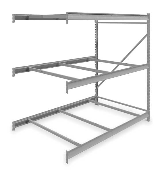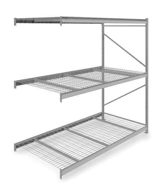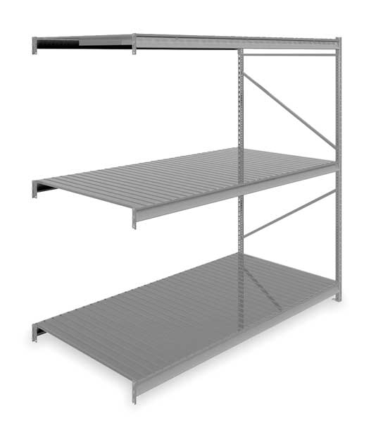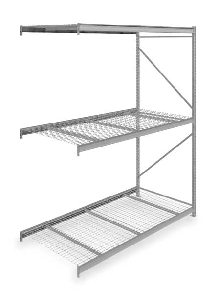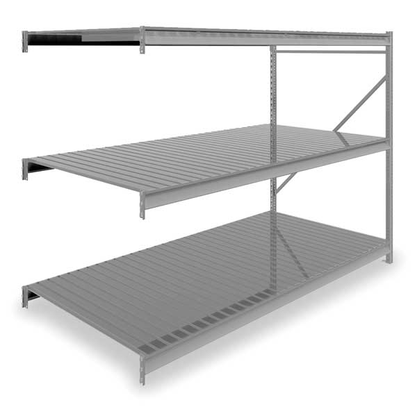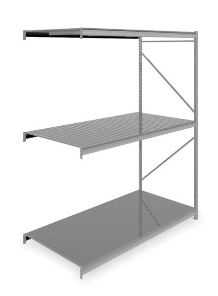 $1,353.74 / eachWeb priceAdd-On Bulk Storage Rack, 48 in D, 96 in W, 3 ShelvesSKU G2495771CategoriesDescription Bulk Storage Rack, Shelving Type Add-On, Overall Width 96 in, Overall Depth 48 in, Overall Height 120 in, Decking Material Steel, No. of Shelves 3, Shelf Capacity 2150 lb, Load Capacity 6450 lb, Shelving Frame Material Steel, Gray, Finish - Shelving and Racks Powder Coated, Shelf Adjustments 2 in, Shelving Gauge 22, For Use With Tennesco Bulk Storage and Boltless Racks, Includes (3) Shelves, End FramegraingerSKU: 7B142, mscSKU: , zoro_no: G2495771, mongo_id: 65bbe82222d7a989a98dbdb1