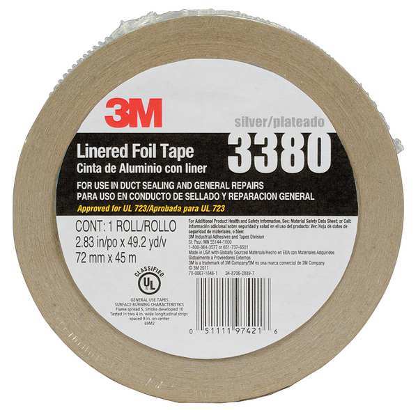 Foil Tape with Liner, 2-53/64inx49yd, SlvrSKU G6145501Categories Adhesives, Epoxy & SealantsDescription Tape Type Foil Tape, Tape Sub-Type General Purpose Foil Tape, Tape Brand 3M(TM), Series 3380, Imperial Tape Length 49 yd, Imperial Tape Width 2 13/16 in, Imperial Tape WxL 2 13/16 in x 49 yd, Common Industry Assembly & Manufacturing, General Maintenance & Repair, Warehouse, Indoor and Outdoor, Maximum Tape Performance Temperature 260 Degrees F, Minimum Tape Performance Temperature -30 Degrees F, Continuous Roll, Tape Adhesive Material Acrylic, Tape Backing Material Aluminum, Liner Included YesgraingerSKU: 29WR76, mscSKU: , zoro_no: G6145501, mongo_id: 65bbee06526e052139ae4f35