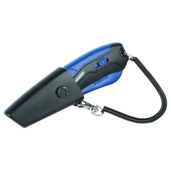 • Safety Knife, Self-Retracting, Multipurpose, Straight Steel Blade, Plastic Handle, Blue/Black