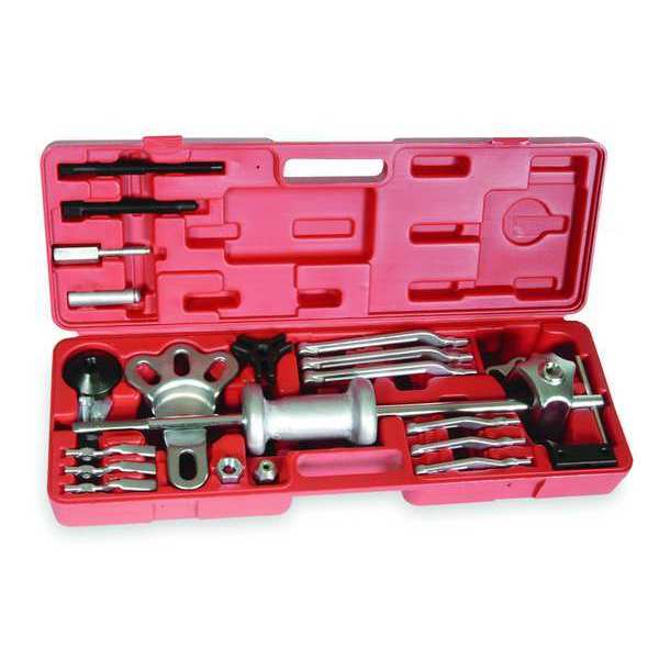 Description Slide Hammer Puller Set, Jaw Spread - Maximum 6 1/2 in, Jaw Types Included Reversible, Includes 2-Way Cross Block, 3-Way Cross Block, 5 lb Slide Hammer, Case, Cone, Dent Puller, Forcing Screw, Front Hub Puller Assembly, Grip Wrench Adapter with Single Lead, Puller Hook Attachment, Rear Axle Pulling Attachment, Sleeve, Jaw Spread - Minimum 2 3/8 in, Number of Jaws Convertible 2 and 3