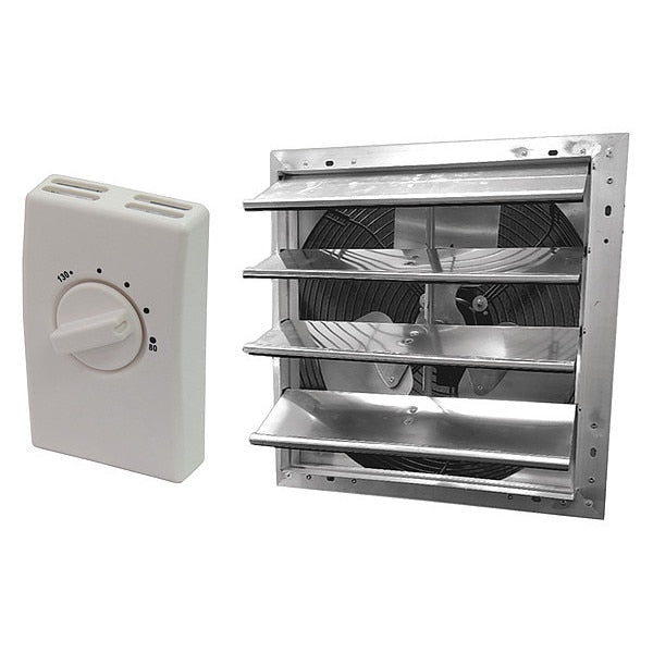 Description Attic Exhaust Fan, Control Type Thermostat, Blade Material Aluminum, Exhaust Airflow @ 0.000 in SP 1,095 cfm, Fire Safety Shut-Off No, High-Efficiency Motor No, Housing Material Aluminum, Includes Humidistat No, Includes Shutter Yes, Includes Thermostat Yes, Maximum Attic Area 1,500 sq ft, Motor Horsepower 1/10 hp, Mounting Location Gable, Nameplate Voltage 120V AC, Overall Height 19 1/4 in, Overall Length 8 in, Overall Width 19 1/4 in, Dome Shape Not Applicable, Dome Width Not Applicable