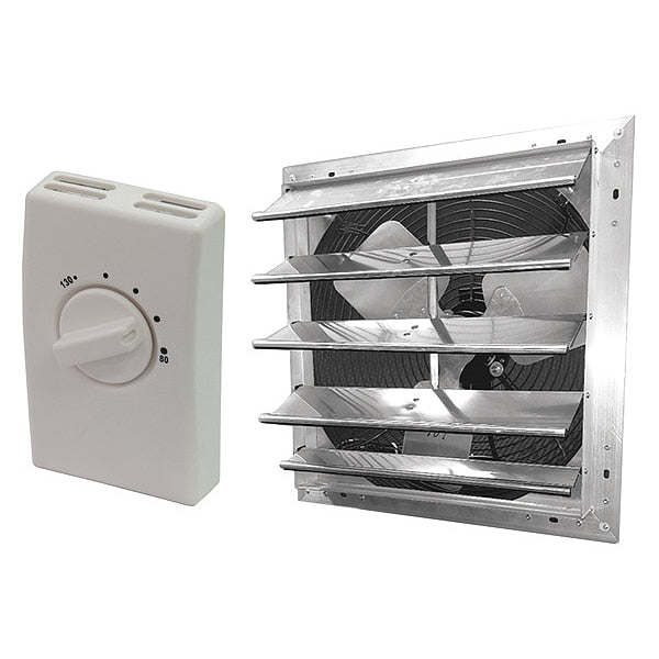 Description Attic Exhaust Fan, Control Type Thermostat, Blade Material Aluminum, Exhaust Airflow @ 0.000 in SP 1,860 cfm, Fire Safety Shut-Off No, High-Efficiency Motor No, Housing Material Aluminum, Includes Humidistat No, Includes Shutter Yes, Includes Thermostat Yes, Maximum Attic Area 2,300 sq ft, Motor Horsepower 1/15 hp, Mounting Location Gable, Nameplate Voltage 120V AC, Overall Height 21 1/4 in, Overall Length 8 in, Overall Width 21 1/4 in, Dome Shape Not Applicable, Dome Width Not Applicable