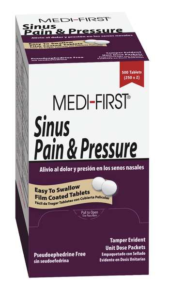 $48.61 / eachWeb priceSinus Pain and Pressure, Tablet, PK500SKU G3957082CategoriesDescription Sinus and Allergy, Medicinal Form Tablet, Medicinal Count 500 x 1, Package Type - First Aid and Wound Care Box, Wrapped Packets, Medicinal Strength Regular Strength, Medicinal Flavor Unflavored, Formula Acetaminophen 500mg, Phenylephrine HCl 5mg, Package Quantity 500graingerSKU: 3NNR7, mscSKU: , zoro_no: G3957082, mongo_id: 65bbea4122d7a989a99a3f9e