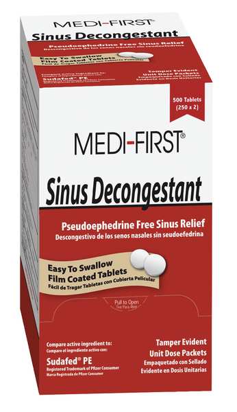 $25.86 / eachWeb priceSinus Decongestant, Tablet, PK250SKU G2425105CategoriesDescription Sinus Decongestant, Medicinal Form Tablet, Medicinal Count 250 x 1, Package Type - First Aid and Wound Care Box, Wrapped Packets, Medicinal Strength Regular Strength, Medicinal Flavor Unflavored, Formula Phenylephrine HCL, Package Quantity 250graingerSKU: 3NNR5, mscSKU: , zoro_no: G2425105, mongo_id: 65bbe7f59a749db822768ccd