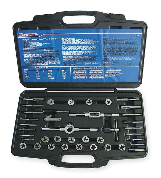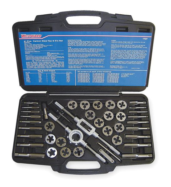 SKU G0336253CategoriesDescription Tap and Die Set, Number of Pieces 41, Die Shape Round Fixed, Tap Type Straight Flute, Die Material High Speed Steel, Thread Sizes Included 1/2 In.-13, 1/2 In.-20, 1/4 In.-18, 1/4 In.-20, 1/4 In.-28, 1/8 In.-27, 3/4 In.-10, 3/4 In.-16, 3/8 In.-16, 3/8 In.-24, 5/16 In.-18, 5/16 In.-24, 5/8 In.-11, 5/8 In.-18, 7/16 In.-14, 7/16 In.-20, 9/16 In.-12, 9/16 In.-18graingerSKU: 1PZ50, mscSKU: , zoro_no: G0336253, mongo_id: 65bbe79a3aaddbd5a90a45ee