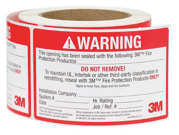Label, 5 In., Red/White, 250 Labels/RollSKU G5254837CategoriesDescription Label, Fire Rating Not Applicable, For Pipe Size Not Applicable, For Use On Joint and Penetration Firestop Systems, Includes (250) Labels, Includes Mounting Hardware Not Applicable, Outside Diameter Not Applicable, Overall Height 3.15 in, Overall Length 4.55 in, Overall Width 4.55 in, Product Type Fire Penetration Warning Label, Shape Rectangular, Usage Location Commercial Construction Surfaces, Color Red, White, For Use With 3M Firestop SystemsgraingerSKU: 23TM23, mscSKU: , zoro_no: G5254837, mongo_id: 65bbea0a22d7a989a99917e7