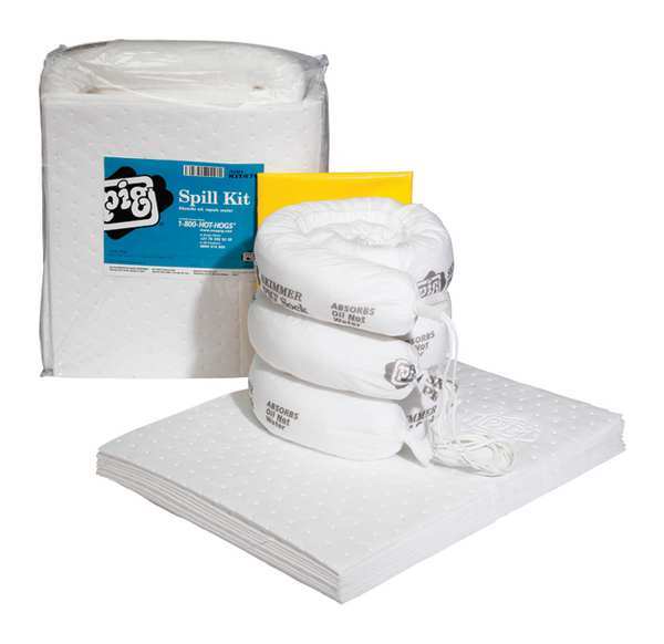 SKU G8377101CategoriesDescription Spill Kit, Fluids Absorbed Oil Based Liquids, Volume Absorbed Per Kit 6 gal, Container Type Portable Bag, 5 in W x 15 in L x 18 in H Container Size, White, Filled, Sorbents Included (12) 20 in L x 15 in W Pig STAT-MAT Oil-Only Absorbent Pad (MAT214), (3) 48 in L x Ext. dia. 3 in Pig Skimmer Oil-Only Absorbent Sock (104PS), Additional Components Included (2) 18 in W x 30 in H Polyethylene Disposal Bags (BAG20-1S), Clear Vinyl Bag, Lockable No, Static Dissipative Yes, UV Resistant NograingerSKU: null, mscSKU: null, zoro_no: G8377101, mongo_id: 65bbe5b83aaddbd5a9fe1336
