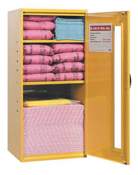 SKU G8013223CategoriesDescription Spill Kit, Fluids Absorbed Acids, Bases, Volume Absorbed Per Kit 10 gal, Container Type Wall Cabinet, 12 3/4 in W x 20 in L x 30.0625 in H Container Size, Yellow, Filled, Sorbents Included (10) 8 in W x 8 in L x 1 in H Pig HazMat Chemical Absorbent Pillow in Dispenser Box (PIL302), (40) 12 1/4 in W x 13 in L Polypropylene Wipers, (75) 10 in W x 13 in L Pig HazMat Chemical Absorbent Handy Pad in Dispenser Box (MAT351)graingerSKU: 30RE63, mscSKU: , zoro_no: G8013223, mongo_id: 65bbe99f22d7a989a9968dd4