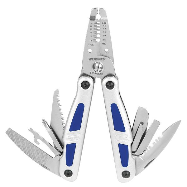 Description Multi-Tool, Blade Edge Type Serrated, Straight, Blade Length 2 3/8 in, Features Wire Stripper, Drywall Saw, Phillips and Large and Small Slotted Screwdrivers, Wire Hook, File, Cable Splicer, Knife, Handle Color Blue, Silver, Handle Material Stainless Steel, Handle Style Ergonomic