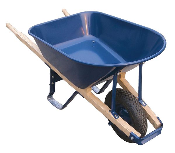Description Wheelbarrow, Tray Material Steel, Capacity 6 cu ft, Hardwood Handles, Number of Wheels 1, Wheel Type 4.00/4.00-8, Pneumatic, Wheel Material Rubber, Steel, Wheel Dia. 15 1/2 in, Wheel Width 6 in, Axle Dia. 5/8 in, 286 lb Load Capacity