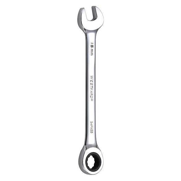 Description Ratcheting Wrench, Alloy Steel, Chrome, Head Size 15 mm, Overall Length 7 7/8 in, Head Offset Angle 0 Degrees , Standard, Head Thickness 3/8 in, Metric, Rounded