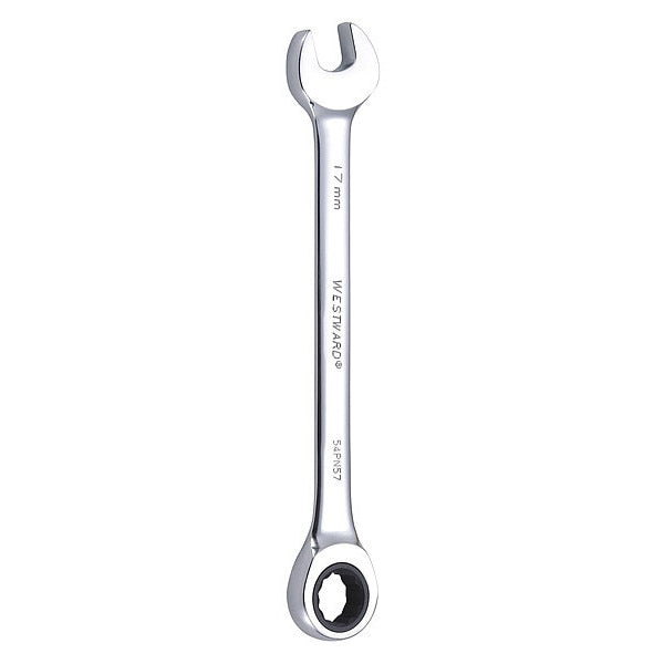 Description Ratcheting Wrench, Alloy Steel, Chrome, Head Size 17 mm, Overall Length 8 7/8 in, Head Offset Angle 0 Degrees , Opening Angle (Deg.) 15 Degrees , Standard, Head Thickness 7/16 in, Metric, Rounded
