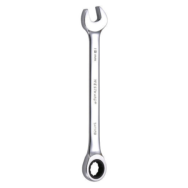 Description Ratcheting Wrench, Alloy Steel, Chrome, Head Size 19 mm, Overall Length 9 3/4 in, Head Offset Angle 0 Degrees , Opening Angle (Deg.) 15 Degrees , Standard, Head Thickness 7/16 in, Metric, Rounded