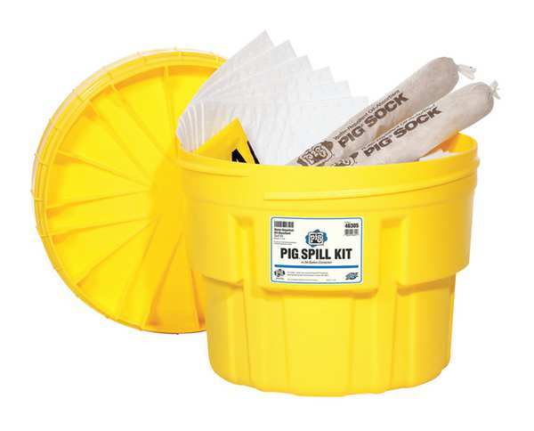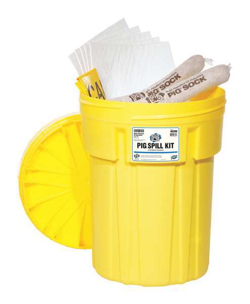 SKU G7950521CategoriesDescription Spill Kit, Fluids Absorbed Oil-Only, Volume Absorbed Per Kit 39 gal, Container Type Can, 55 gal Container Capacity, 26 4/5 in W x 33 in H Container Size, Yellow, Filled, Sorbents Included (2) 10 ft L x Ext. dia. 5 in Pig Oil-Only Absorbent Boom (BOM405), (40) 20 in L x 15 in W Pig STAT-MAT Absorbent Pad (MAT214), (9) 10 ft L x Ext. dia. 3 in Pig Oil-Only Absorbent Boom (BOM406)graingerSKU: 30RE18, mscSKU: , zoro_no: G7950521, mongo_id: 65bbe81a9a749db822775651