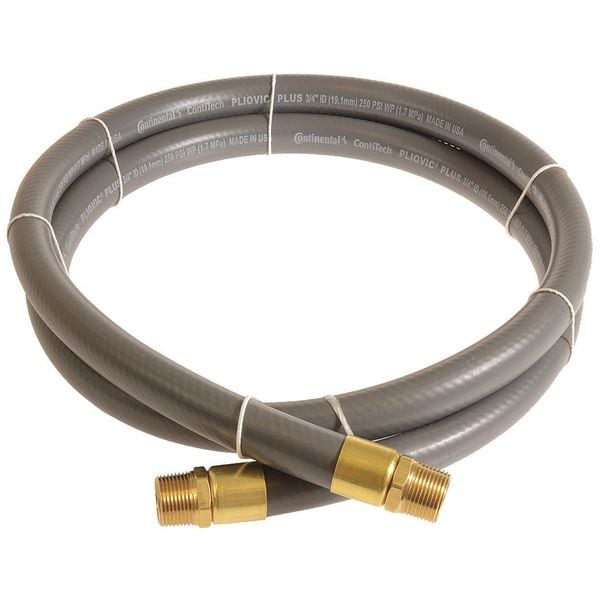 $118.94 / eachWeb price3/4" x 10 ft PVC Coupled Multipurpose Air Hose 250 psi GYSKU G5241251CategoriesDescription Air Hose, Hose Inside Dia. 3/4 in, Hose Outside Dia. 1 1/8 in, Hose Length 10 ft, Hose Color Gray, Hose Tube Material PVC, Hose Cover Material PVC, Burst Pressure 1,000 psi, Max. Working Pressure @ 70 F 250 psi, Temp. Range -10 Degrees to 158 Degrees F, Hose Reinforcement Type Spiral, Hose Reinforcement Material Polyethylene, Safety Factor 4:1, Hose Fitting A Material Carbon Steel, Hose Fitting B Material Brass, Hose Fitting A Type MNPT, Hose Fitting B Type FNPT, Hose Fitting A Size 3/4 ingraingerSKU: null, mscSKU: null, zoro_no: G5241251, mongo_id: 65bbe5d63aaddbd5a9fed83c