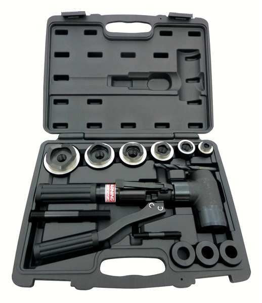 SKU G2004171Categories Lifting and HydraulicsDescription Hydraulic Punch Driver Set, Number of Pieces 13, Capacity 11 ga Steel, Conduit and Pipe Size 1/2 in to 2 in, Workpiece Material Steel, Driver Angle 180 Degrees , Includes (6) Hydraulic Punch Dies, (3) Adaptors, (2) Power Screws, Drill Bit, Carrying CasegraingerSKU: 39CE85, mscSKU: , zoro_no: G2004171, mongo_id: 65bbe5b43aaddbd5a9fdf6b5